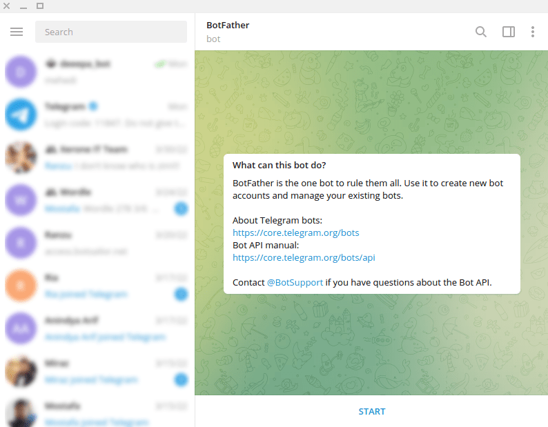 To build a Telegram bot with BotzyBot, first, open your Telegram App. Then in the search bar of the app, search with the ‘BotFather’ keyword. Then select the verified BotFather account.